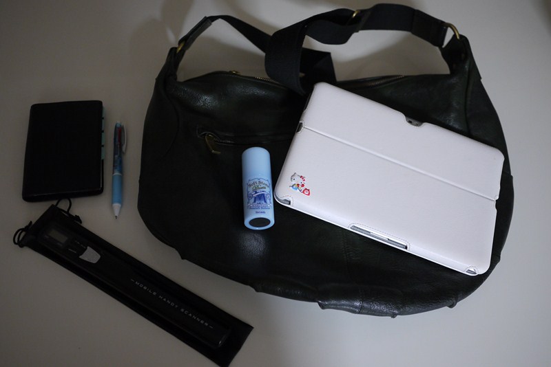 今日の私の鞄の中身は、「SamsungのGalaxy-Tab 10.1 LTE」 それに 「MagicScanのハンディスキャナー」、それから 「Bindexの手帳」、ただしこちらはBindexとはいっても普通のBindexサイズの手帳ではなくて、ふたまわり程小さい 「ミニサイズ6穴のリファイル」。