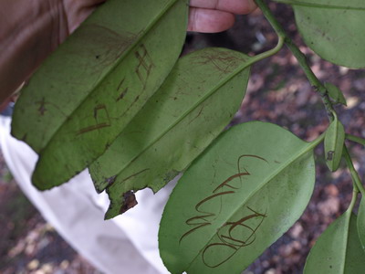 ちなみに写真はタラヨウ(多羅葉)の木の葉で、葉の裏に爪で字を書くと消えない事から、葉書の語源になった木との事(誰かが葉の裏にいたずら書きしてたみたい)。
