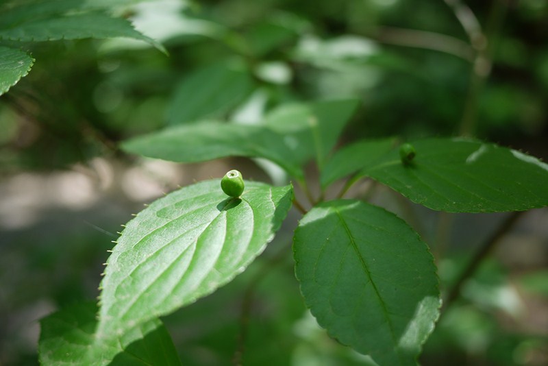 写真の花(葉の真ん中のポツンと丸いものが花)は、花がイカダ(筏)に乗っているようなのでハナイカダ(花筏)という樹木。