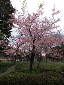 梅が咲いている⑳梅林坂を上って⑦本丸の芝生のまわりに着くと、カワズサクラ(写真)、ツバキカンザクラ、カンザクラがそれぞれ1~2本づつ咲いていた。