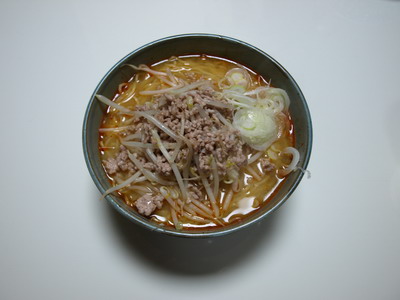 5.ラーメンを茹であがったら、丼にラーメンを入れ上から炒めた挽肉とモヤシ、ネギをのせて出来上がり。
